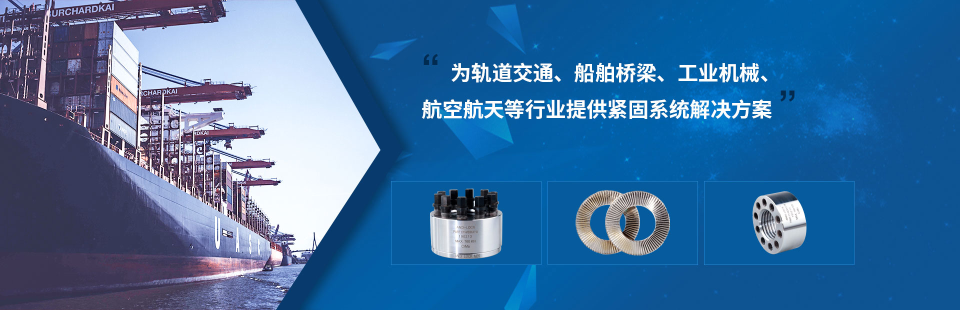 大連安迪機械設備有限公司位于美麗的濱海城市大連,是一個集科、工、貿為一體的全球性供應商,自公司1996年成立以來,一致奉行"以質量求生存、以科技求進步、以客戶求市場"的生產和經營理念,公司自主研發、專業生產防松墊圈、止退墊圈、雙疊自鎖墊圈、din25201、高鐵聲屏障墊圈、超級螺栓,頂推螺母,多級頂推張緊器,螺母型張緊器等精密機械。并同時代理銷售國內外各大知名品牌緊固件。